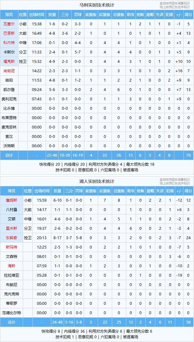 马刺(客队):凯尔登13分6板、巴恩斯13分1板、福克斯10分4板3助、卡斯尔9分4板4助、哈珀9分2板2助、尚帕尼7分3板1助、瓦塞尔5分1板1助2断、科内特4分4板1助、奥利尼克1板3助