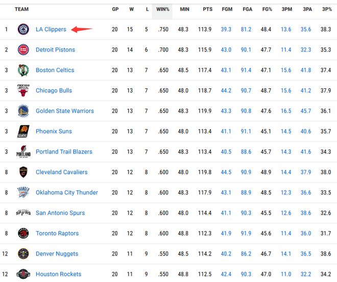 近20场胜率排名:快船居首勇士开拓者并列第3雷霆第8火箭第12