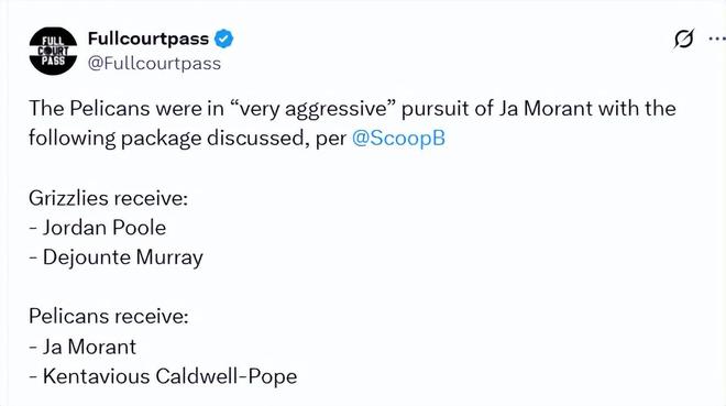 罗宾逊表示,这是一笔孤注一掷的豪赌。鹈鹕若能将莫兰特纳入阵中,与锡安联手,鹈鹕队瞬间就能跻身全联盟 “最具收视吸引力” 的球队之列。但鹈鹕的野心不止于此,他们还抛出了多套不同的交易方案,试探灰熊队是否会为阵容深度和老将经验动心。