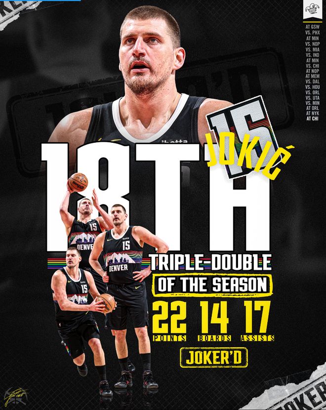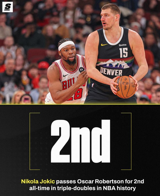 这场比赛也是约基奇的里程碑之夜,他完成生涯第182次三双升至历史第二位,在他之前只剩下威少,奥斯卡-罗伯特森181次三双正式被超越。