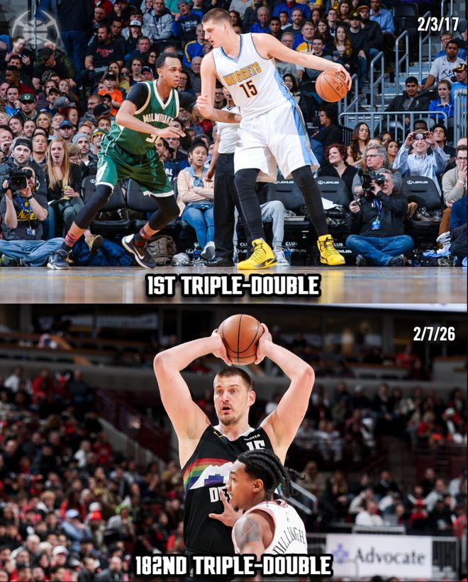 掘金官方晒出了约基奇第一次三双-第182次三双的时间跨度,2017年2月3日-2026年2月7日,换言之约基奇182次三双只用了3292天历史最快。