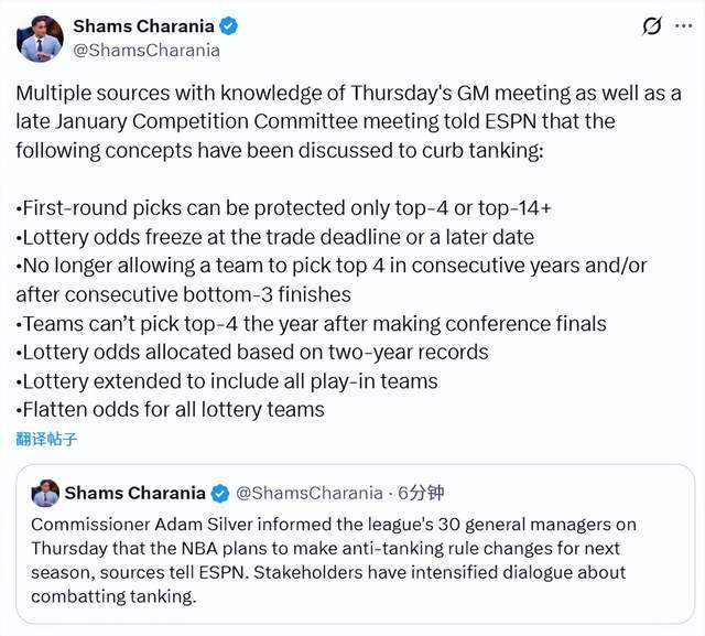 多位了解总经理会议及1月末竞争委员会会议的消息人士向ESPN表示,目前讨论的反摆烂方案如下——