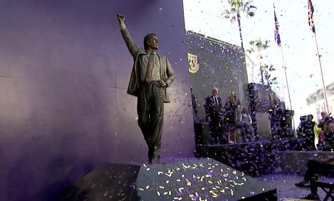 北京时间2月23日,湖人为球队传奇主教练帕特·莱利举行雕像揭幕仪式。莱利的雕像造型是左手叉腰,右手高举拳头,显得很有气势。昔日弟子韦德前来捧场,美媒调侃莱利的雕像比韦德的强多了。莱利雕像高2米41,重231公斤,是队史第8位拥有雕像的人物。