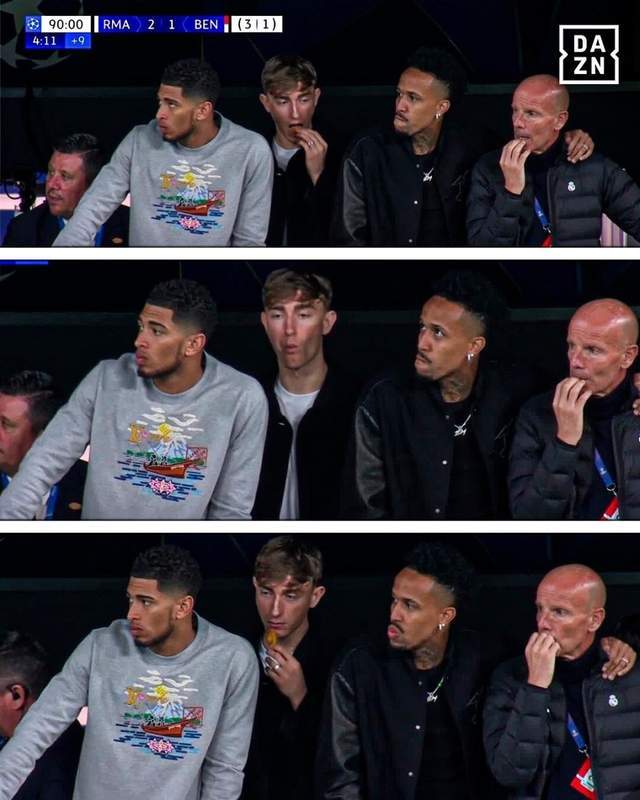 而在比赛快要结束的时候,赫伊森与贝林厄姆、米利唐等伤员来到替补席上,其余2人都对场上的形势非常关注,但赫伊森却只顾往嘴里塞东西,而且左顾右盼,似乎已经神游天外。比赛结束后,有皇马球迷忍不住在社媒上发出批评:“赫伊森到底是什么人,他根本不在乎任何事!”