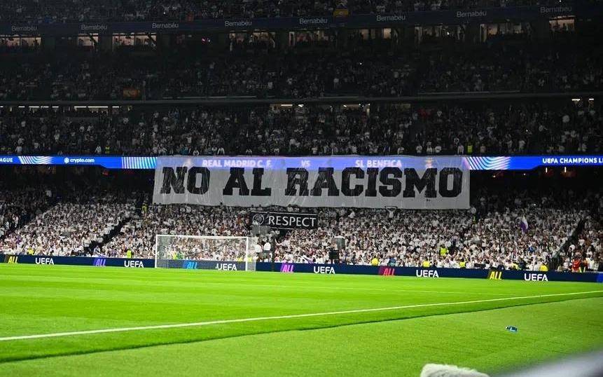 北京时间2月26日凌晨,欧冠淘汰赛附加赛次回合,皇家马德里坐镇主场迎战本菲卡,最终皇马2-1,总比分3-1击败本菲卡晋级。本场比赛开始前,伯纳乌球场看台上展示出反种族主义横幅,横幅